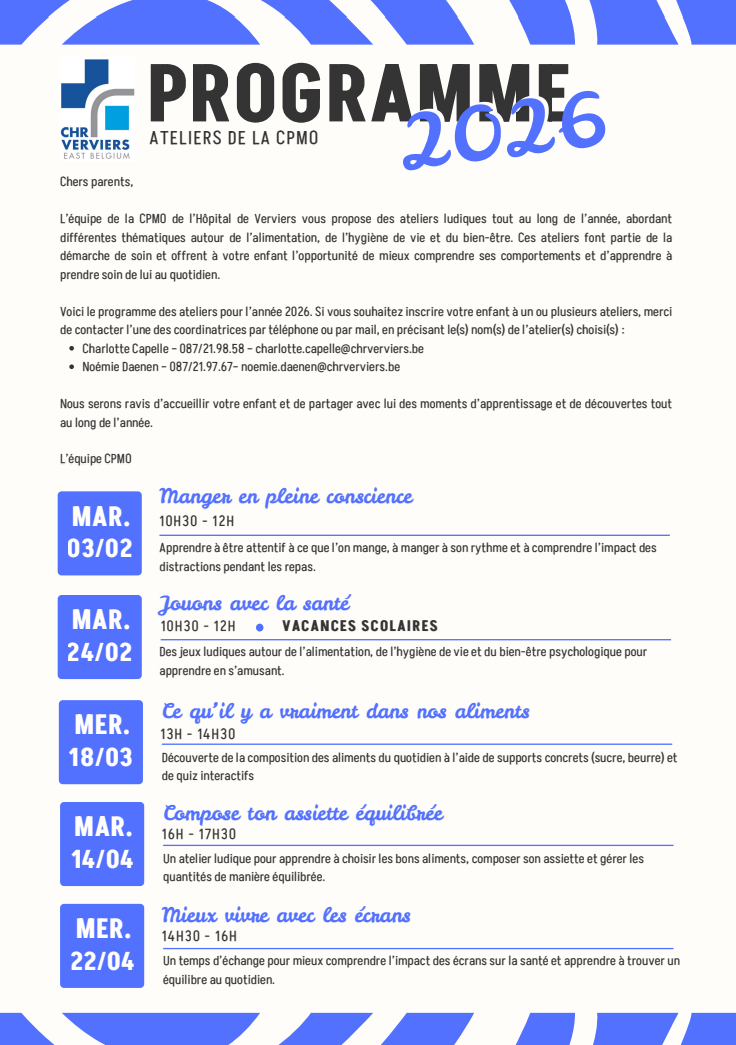 Depuis 2005, l’hôpital est engagé dans la prise en charge de l’obésité infantile à travers différents projets (COP, puis CEPP), initiés sous la supervision du Dr Richelle et du Dr Mazoin. Après près de 20 ans de continuité des soins, le projet a été repris par le Dr Fernandez suite au départ à la pension du Dr Richelle.