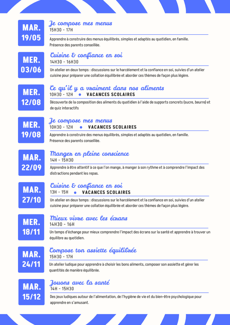 Le premier rendez-vous (bilan d’entrée) a lieu le mercredi matin. Après ce bilan, un programme personnalisé est proposé à votre enfant et à votre famille.
